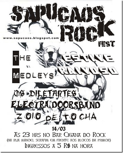 O Sapucaos festejará o seu primeiro ano de vida com um festival da melhor qualidade com bandas totalmente independentes de três cidades da região. Serão elas: The Medleys, Estive Raivoso, Elektra Doors Band, Zóio de Tocha e Os Diletantes. Nesse início de comemorações eu falarei sobre cada banda que tocará neste festival até o dia da realização dele. Esse será o cartaz que fará a divulgação pelas cidades: